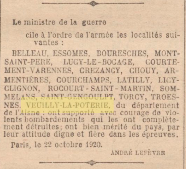 La commune de Veuilly la Poterie fut citée à l’ordre de l’armée par décret du 22 octobre